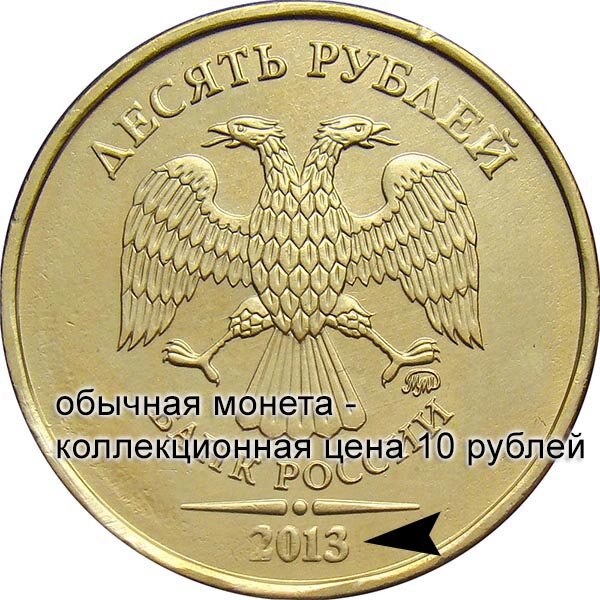 Среди 10 рублевых монет 2013 года существует чрезвычайно редкая разновидность, отличающаяся шрифтом которым выполнена дата обозначающая год выпуска. Цифры 2013 на этой монете более тонкие и исполнены в другом начертание. Особенно заметно отличие у цифры 3, у которой нижняя часть хвостика прямая, в отличие от обычных монет, у которых тройка заканчивается снизу жирной точкой. Пока найдена только одна такая монета. Почему эта монета так существенно отличается от всего остального тиража, можно только предполагать. На некоторые мысли наталкивает тот факт, что толщина и стиль шрифта цифр даты на этой монете напоминает исполнение даты на монетах прошлых лет. Так что вполне возможно, что это результат опробования предварительно изготовленного штемпеля, сделанного в стилистике предыдущих лет, который впоследствии был заменен более новым и не стал применяться для изготовления монет 2013 года. А те, что все-таки были им предварительно отчеканенные, попали в обычный денежный оборот. Так как они