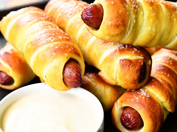 Рецепт на скорую руку. Сосиски в тесте Ингредиенты: -500 г дрожжевого слоеного теста -500 г сосисок -50 г сыра (по желанию) -яйцо для смазки Приготовление: Тесто разморозить, немного раскатать в длину, до толщины 4-5 мм. Порезать полосками шириной примерно 1,5-2 см. Сосиски очистить от оболочек. Завернуть сосиску в полоску теста по спирали и слегка внахлест (края сосиски должны слегка выглядывать). Можно по желанию использовать сыр. Сделать в сосиске небольшой надрез по длине, внутрь вложить немного натертого на крупной терке сыра. И так же обмотать полоской теста. Заготовки выложить на противень, застеленный пекарской бумагой. Оставить на 15-20 минут. Яйцо слегка взбить, смазать заготовки сверху и по боками. Поставить в разогретую до 200 градусов духовку. Выпекать примерно 20 минут. Готовые изделия имеют загорелый верх. Сосиски в тесте можно есть как теплыми, так и холодными. Приятного аппетита!