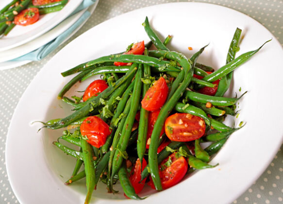 Выложить в салатник фасоль, добавить помидоры. Добавить заправку и все перемешать.