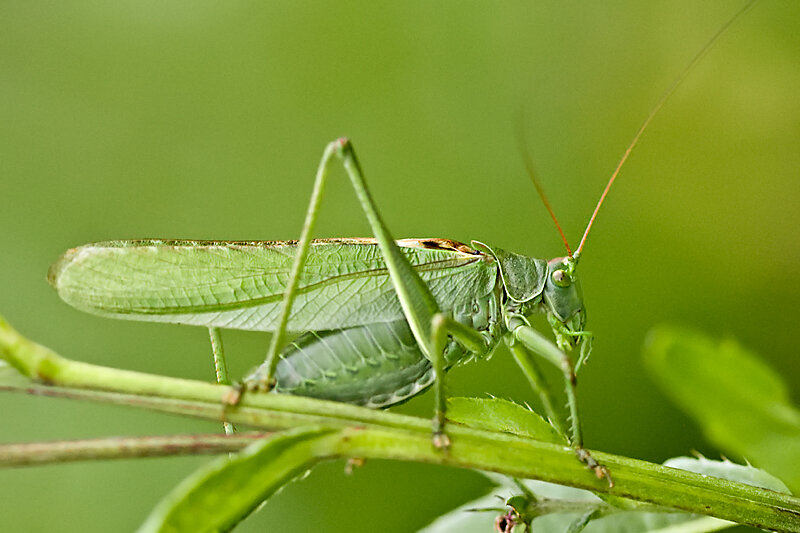 Зелёный кузнечик – лат. Tettigonia viridissima, представитель типа членистоногие, относится к классу насекомые. Зелёный кузнечик – беспозвоночное животное, обладает красивой формой тела. Особенностью зелёного кузнечика, является наличие на передних ногах – органа слуха. Тело состоит из головы, груди и брюшко. Голова сильно увеличена в размерах, туловище сжато с боков и имеет цилиндрическую форму. Ноги обладают хорошей мускулатурой и сильно удлинены. Размножение половое. Зелёный кузнечик питается разнообразными продуктами, в основном это растительная пища, но может и некоторыми мелкими беспозвоночными. Распространён зелёный кузнечик по все планете, обитает в высокой траве и другой растительности.