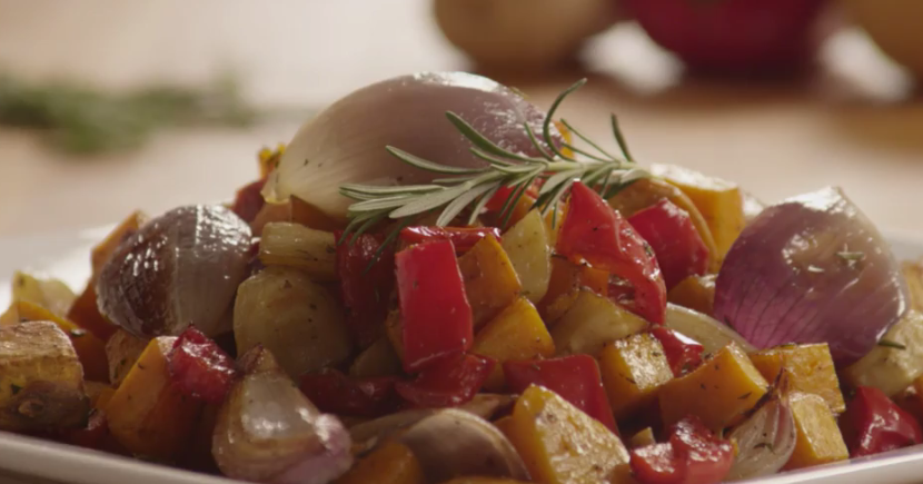 Очень простой, но от этого не менее вкусный и ароматный рецепт овощей подойдет в качестве самостоятельного блюда, либо на гарнир к мясу или птице. Время приготовления 50 минут, количество порций-12. Ингредиенты 1 средний кабачок 400 гр. очищенной тыквы 3-4 шт. среднего картофеля 2 красных болгарских перца 1 маленькая красная луковица 1 столовая ложка нарезанного свежего тимьяна 2 столовые ложки свежего розмарина 2 столовые ложки бальзамического уксуса (можно заменить лимонным соком) 50 мл оливкового масла Соль и черный молотый перец по вкусу Приготовление Разогреть духовку до 240 градусов. В большой миске смешать порезанные на крупные кубики кабачки, тыкву, картофель, перец. Разрезать на 4 части луковицу и разобрать на части. Тимьян и розмарин мелко нашинковать и посыпать овощи. Добавить оливковое масло, специи и соль, бальзамический уксус, перемешать и уложить на противень. Готовить в течение 40-50 минут, периодически перемешивая, пока овощи не приготовятся и не приобретут зол