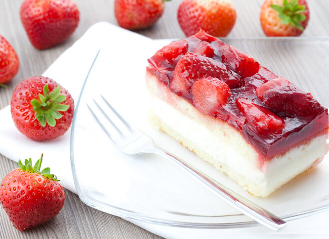 Ингредиенты: для бисквита: 2 яйца, 3 ст. ложки муки, 3 ст. ложки сахара, 10 г разрыхлителя. для крема: 200 г клубники, 1 стакан сахара, 80 г сливочного масла, 250 г творога, 250 г сметаны, 250 г жирных сливок, 2 ст. ложки сахара, 20 г желатина для украшения: 300 г клубники, 1 упаковка желе быстрого приготовления. Приготовление: Яйца с сахаром взбить в пышную пену, примерно 7-8 минут. Просеянную муку соединить с разрыхлителем и добавить к взбитым яйцам. Выложить тесто в смазанную маслом и застеленную бумагой для выпекания форму и отправить в разогретую до 180°С духовку. Бисквит для клубничного торта выпекается 8-10 минут. Готовый бисквит остудить, убрать бумагу, а затем поместить в разъемную форму. Желатин замочить в небольшом количестве воды. Пюрировать 150 г клубники и стакан сахара. Небольшим количеством клубничного пюре смазать поверхность бисквита. Остальную ягодную массу нагреть, добавить набухший желатин, довести до кипения, но не кипятить, и готовить до растворения желатин