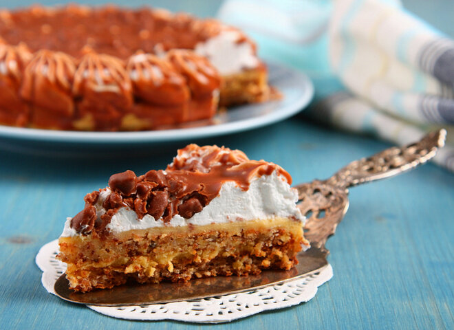 Промазать коржи кремом, на верхнюю часть торта тоже нанести крем и выложить миндальные лепестки. Убрать торт в холодильник или, что еще лучше, в морозилку на 6-8 часов.