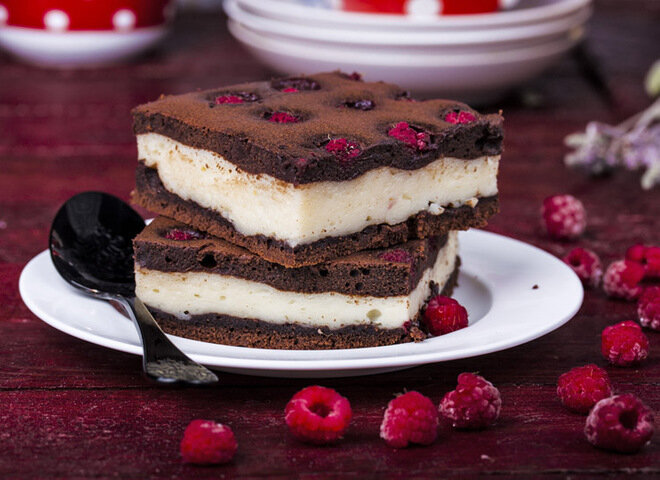 Попробуйте шоколадный творожный пирог с нежнейшим суфле и вкраплениями сезонных ягод. Вы можете использовать любые ягоды, которые подвернутся под руку – свежую клубнику, малину, вишню, черешню, смородину, а также варенье, если сезон уже прошел. Кстати подчеркнуть ягодный вкус можно за счет различных наполнителей фруктового йогурта. От этого пирог только выиграет. Ингредиенты: для коржей: 2 яйца, 100 г сливочного масла, 150 г муки, 100 г сахара, 10 г ванильного сахара, 3 ч. ложки какао, 200 г ягод. Приготовление: Растереть размягченное масло с сахаром и ванильным сахаром, добавить яйца и перемешать. Всыпать просеянную муку, какао и взбить в однородную массу. Разделить тесто на две части. Выложить каждую часть тонким слоем в застеленную пергаментом и смазанную маслом форму для выпекания. Равномерно распределить по тесту ягоды. Выпекать коржи в разогретой до 200-210°С духовке 10-12 минут. Остудить. Приготовить творожное суфле. Для этого желатин растворить в теплой воде, как указано