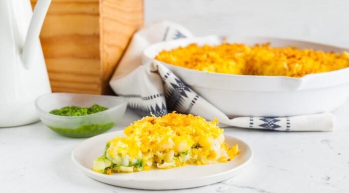 Ингредиенты: для соуса и макарон 40 г сливочного масла 90 г муки 275 мл молока 4% 100 г тертого пармезана 60 г домашнего песто 250 г любой короткой пасты (фарфалле, ракушки и т.п.) соль, перец для топинга 40 г сливочного масла 60 г сухарей 100 г тертого пармезана Приготовление: Духовку разогреть до 220С. Для топинга растопить масло, смешать с сухарям панко и 100 г пармезана. Для соуса растопить 40 г сливочного масла в сотейнике на среднем огне. Добавить муку, растереть лопаткой вместе с маслом и готовить 3 минуты, постоянно растирая лопаткой. Добавить 100 г тертого пармезана, соль, перец. Перемешать и снять с огня. Накрыть соус сверху бумагой для выпечки и дать остыть. Пасту отварить в большом количестве кипящей подсоленной воды до состояния аль-денте. Воду слить, полстакана жидкости сохранить. Смешать в миске пасту, оставшуюся от варки воду, соус. Выложить половину смеси в смазанную маслом форму для запекания. Разровнять и смазать поверхность песто. Затем выложить вторую часть ма