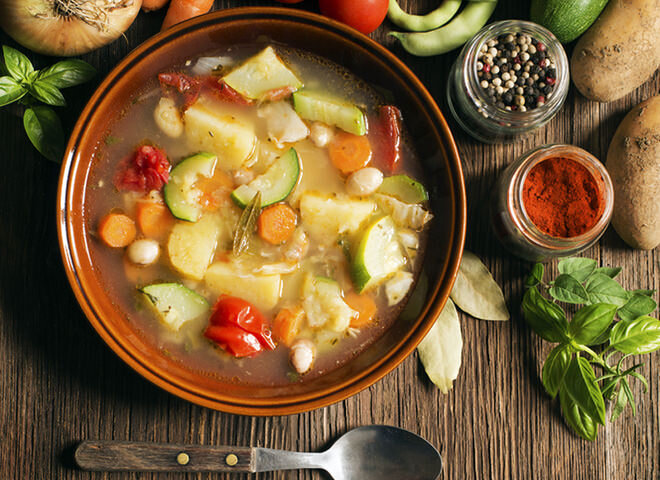 Овощное рагу – прекрасный вариант решения вопроса, чем накормить семью, гостей, друзей, когда не планируешь готовить особо ничего серьезного, но, тем не менее, хочется в результате получить что-то вкусное и несложное. В этом случае на помощь хозяйке придет именно овощное рагу. Вообще принцип овощного рагу сводится к приготовлению блюда из любимых накрошенных овощей, которые закладываются в толстостенную посуду – кастрюлю, сковороду или сотейник – в правильном порядке по мере их приготовления. В остальном – все очень просто. Вы можете в это блюдо добавить практически любые овощи – на то оно и овощное рагу. Рецепт допускает корректировку по вашему усмотрению и вкусу. То же относится и к количеству жидкости: чем больше бульона или воды, тем больше оно будет похоже на суп. Ингредиенты: 2 кабачка, 5 картофелин, 1 болгарский перец, 3 помидора, 1 морковь, 1 луковица, 1 пучок зелени (укроп, петрушка), 2 зубка чеснока, 2 ст. ложки растительного масла, 2 лавровых листа, щепотка молотого кор