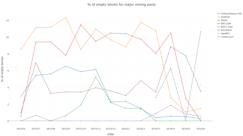 Биткоин пулы начали добывать пустые блоки. Совсем пустые сказать нельзя,ведь он содержит хотя бы одну сделку. Пустой блок не быстрее и не легче полных блоков. Для исключения траты мощности впустую, пул начинает добывать новые блоки, которые являются пустыми. Биткоин пулы в которых отсутствуют пустые блоки: CKPool, Bitfury, Kano.