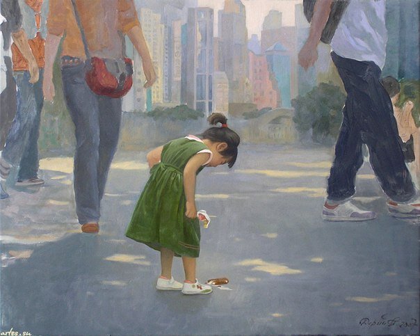 Москва. Улица. Мать и ребенок. Он роняет мороженое, корчит рожу, подвывает, и вот уже слезы скоро брызнут.