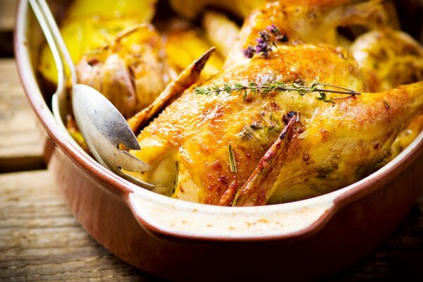 Ингредиенты: тушка курицы весом около 2 кг соль молотый перец лимон, разрезанный пополам головка чеснока, разрезанная пополам розмарин, тимьян, петрушка — по 1/4 пучка оливковое масло — 1/4 стакана мелкий картофель — 680 г Приготовление: Промыть курицу внутри и снаружи, промокнуть насухо бумажными полотенцами. Приправить солью и перцем, а затем наполнить лимоном, чесноком и зеленью. Поместить курицу на противень грудкой вверх. Связать ноги курицы кулинарным шпагатом. Разложить картофель вокруг курицы. Приправить солью и перцем, сбрызнуть оливковым маслом. Запекать курицу и картофель от 1 до 1 1/2 часов. Курицу нужно поливать выделяющимся соком и поворачивать форму каждые 20 минут, чтобы получилась красивая золотистая корочка. Переложить курицу на блюдо и дать постоять в течение 10 минут. Подавать вместе с запеченным картофелем. Приятного аппетита! 😉 Понравился рецепт? Поставьте лайк 💙 😉 Наш сайт - https://recase.org 😉 Мы вконтакте - https://vk.com/recase_org