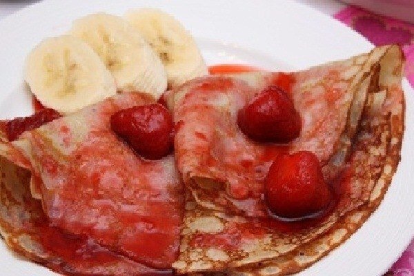 Ингредиенты: 200 мл молока 2 банана 40мл растительного масла 100г муки 50г сахара 2 яйца клубничное варенье Приготовление: Для начала пару бананов измельчим в блендере до однородности. Чтобы было легче это сделать, добавьте туда половину всей порции молока. В банановую массу добавляем яйца, сахар, оставшееся молоко и масло. Все соединяем, затем кладем просеянную муку и хорошо размешиваем до однородности. Блинчики печем на разогретой и слегка смазанной маслом сковороде. Обратите внимание, что печь банановые блинчики может быть непросто с непривычки, но если сделать огонь небольшим, то будет намного легче. Готовые обжаренные с двух сторон блинчики складываем стопкой и отставляем в сторону. Подавать теплыми вместе с вареньем! Приятного аппетита!