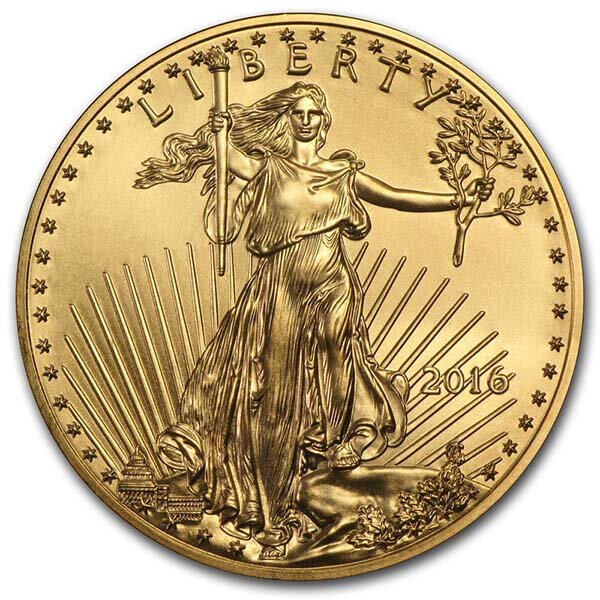 Золотой орел, или как её еще называют Американский орел, одна из самых известных золотых инвестиционных монет мира. В ней содержится ровно одна тройская унция (31,1 грамм) чистого золота его. Ежегодно выпускается около миллиона этих монет номиналом в 50 долларов, но ценятся они исключительно по стоимости содержащегося в ней золота, плюс небольшая наценкой в 5-7 процентов. Средняя цена American Eagle – 1300 долларов. На лицевой стороне инвестиционной денежного знака «Американский орел» American Eagle изображение идущей Свободы заимствовано из популярной монеты начала 20 века «Двойной орел» Gold Double Eagle, выпущенной в 1907 году. Эта композиция часто рассматривается как самый красивый дизайн в американской монетной чеканке: Леди Свобода, уверенно идущая в солнечных лучах, несет в своих руках факел и оливковую ветвь. На оборотной стороне золотой монеты изображен орел в полете, несущий оливковую ветвь в гнездо, где его ждет самка с птенцами. Монета изготавливается каждый год, начи