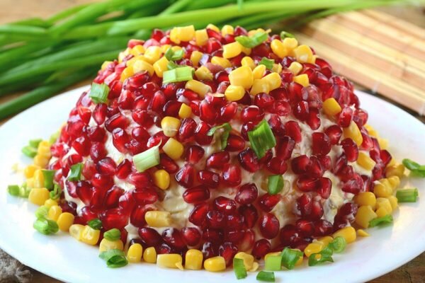 Ингредиенты: говядина - 200 г кукуруза консервированная - 150 г орехи грецкие - 50-70 г яйца - 3 шт. картофель - 2 шт. морковь - 1 шт. гранат - 1 шт. майонез соль Приготовление: Мясо и отварить до готовности, яйца – вкрутую, орехи подсушить на сковородке. Салатник застелить пленкой, выложить слой из тертой мелко морковки, утрамбовать аккуратно ложкой, смазать майонезом, присыпать слоем порубленных орехов, опять смазать майонезом. Сцедить кукурузу (отложить немного для оформления), выложить третьим слоем, смазать майонезом, на него уложить крупно натертые яйца и майонез. Нарезать мясо небольшими кубиками, положить на яичный слой, смазать майонезом, выложить последний слой из натертого крупного картофеля, придавить его слегка ложкой. Осторожно перевернуть салатник на плоскую тарелку, удалить пленку, промазать верх и бока майонезом, присыпать их гранатовыми зернами. Оформить мясной салат с гранатом порубленными перьями зеленого лука и зернами кукурузы