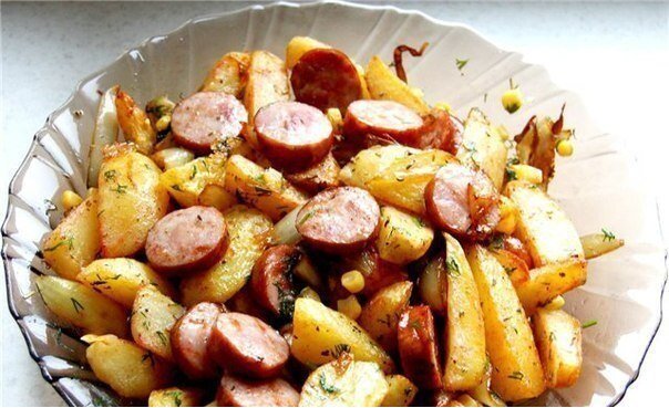 ИНГРЕДИЕНТЫ: ● картофель ● смалец ● чеснок ● копченые колбаски ПРИГОТОВЛЕНИЕ: Картофель очистить от кожуры, помыть, нарезать на четвертинки и отварить до полу готовности, слить воду. Копчёную колбаску (у меня охотничья, как правило), бекон или копчёную курицу порезать на кусочки. Лук почистить и нарезать на дольки крупно, чеснок зубчиками. На противень положить смалец и поставить в духовку на пару минут, чтоб растопился. Если не смалец то растительное масло. Нагреть духовку до 200 С. Картошку переложить на противень и перемешать, что бы все стороны окунулись в жир, добавить тмин, майоран, перец, чуть паприки и снова перемешать. Смесь специй может быть на ваш вкус. Добавить лук, чеснок, колбасу поставить в духовку не накрывая. Через 5-7 мин. Перемешать, и так всё время до готовности картофеля. Следить чтоб ничего не подгорело и почаще мешать. В конце готовки (35-45 мин.) посолить крупной солью. Я перед подачей посыпаю зеленью.