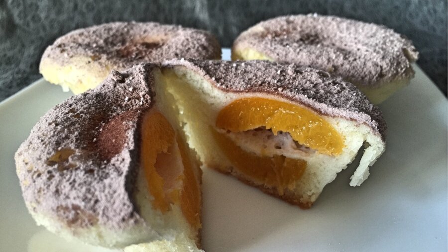 Маффины Абрикосовый поцелуй. Ингредиенты: Маффины Абрикосовый поцелуй. Приготовление: Масло комнатной температуры взбить миксером. Добавить 130 граммов сахара и снова взбить. У трёх яиц отделить желтки от белков. По одному добавить три желтка в масляную смесь. Взбить. Муку смешать с разрыхлителем. Белки и 70 граммов сахара взбить в крутую пену. К масляно-яичной смеси добавлять по две столовых ложки муки и по две столовых ложки взбитых белков, перемешивая, пока не кончатся мука и белки. Для начинки у оставшегося яйца отделить желток от белка. Смешать маскарпоне и желток. Перемешать. Взбить белок с оставшимся сахаром. Добавить к маскарпоне. перемешать. Абрикосы помыть и разрезать пополам. Косточку удалить. Формы для маффинов смазать маслом. Выложить в каждую форму по одной столовой ложке теста. Сверху положитьполовинку абрикоса, придавить. В каждую половинку абрикоса выложить немного начинки. Накрыть второй половинкой абрикоса. На абрикосы выложить ещё по столовой ложке теста Выпекать