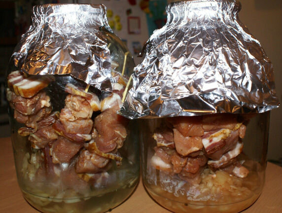 Понадобится 3-х литровая стеклянная банка и маринованное мясо. Ингредиенты для шашлыка в банке: свинина — 1,5 кг лук репчатый — 2-3 шт сок ½ лимона соль перец кориандр приправы для шашлыка вино сухое белое – 200 гр Пошаговое приготовление шашлыка в банке: Мясо промыть и порезать на небольшие кусочки. Добавить соль, перец, специи и сок лимона. Лук протереть на мелкой терке, сок – слить в мясо. Влить 200 гр белого сухого вина Тщательнопомещать, помять руками. Оставить мариноваться на 1 час. Нанизываем на шашлычные палочки мясо. В одну банку кладем 4-5 «шампуров». Закрываем банку фольгой. В фольге сделайте небольшую дырочку уколом шпажки. Важно! Банка должна быть сухая снаружи. Отправляем в холодную духовку (чтоб банка не лопнула), и ставим на 180-200 С на 60-80 минут. Выключаем духовку, ждем 5 минут. Аккуратно (не резко) открываем духовку, чтобы при разнице температур не лопнула банка. Достаем потрясающе аппетитный шашлык! Приятного аппетита, друзья!