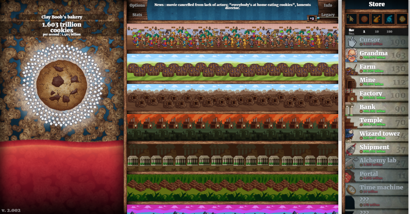 В видеоигру надо играть — нажимать кнопки, водить пальцем по сенсорному экрану, иногда даже кричать в микрофон и трясти контроллер. Однако все эти действия отнимают время, которое можно было бы потратить учебу, работу и прочее саморазвитие. Кроме того, прохождение многих игр требует развития навыка разгадывания загадок, сражения с врагами, вождения, управления армией и тому подобном. А ведь кому-то не хочется тратить долгие часы на изучение мануалов, хочется чтобы все просто — нажми на кнопку, получишь результат. Для таких людей придумали кликеры — жанр игр, где нужно лишь кликать мышкой по цели, получая какой-нибудь ресурс. Самый первый представитель жанра, ставший известным и затянувший множество игроков — Cookie Clicker. На первый взгляд, игровой процесс там примитивный — кликаем мышкой, чтобы печь печеньки. Печем первый десяток, сотню, тысячу печенек… Потом, за накопленные печеньки можно нанять себе в помощь бабушек, которые будут их печь за вас. Они будут давать какое-то колич