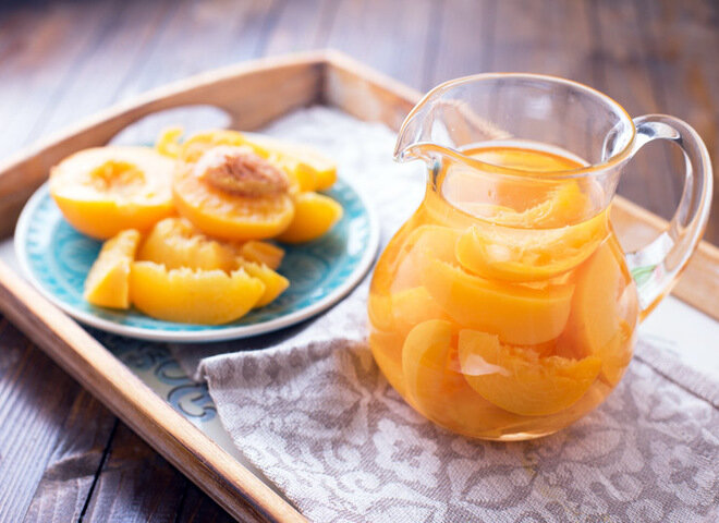 Приготовленный таким образом компот из персиков на зиму получается сладким, насыщенным и необыкновенно ароматным. А сами персики – очень нежными благодаря тому, что они очищены от мохнатой кожицы. Ингредиенты: 3 кг персиков, 300 г сахара из расчета на 1 л воды, лимонной кислоты на кончик ножа. Приготовление: Персики помыть и перебрать, отбирая плотные не переспевшие плоды. Перед тем как варить компот из персиков, их желательно бланшировать, чтобы избавить от мохнатой кожицы. Для этого окунуть их на 1 минуту в кипяток, а затем в холодную воду. Очистить от шкурки, разрезать на 2-4 части в зависимости от размера и очистить от косточек. Положить в подготовленные стерилизованные банки, залить кипятком, накрыть крышками и оставить на 15 минут. Затем слить воду из банок в кастрюлю и добавить сахар в соответствии с указанной пропорцией. Поставить сироп на огонь, довести до кипения и варить 5 минут. Залить персики кипящим сиропом и закатать. Перевернуть банки вверх дном, укутать и оставить