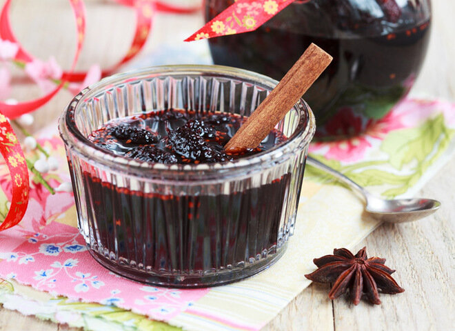 Как же преображается аромат и вкус варенья из шелковицы, если облагородить его пряностями и специями. А нужно всего-то добавить палочку корицы, несколько звездочек бадьяна и чуть-чуть лимона. Рецепт именно такого необыкновенно вкусного, пряного, ароматного и заманчивого варенья мы вам и предлагаем запасти на зиму. Ингредиенты: 2 кг шелковицы, 1 кг сахара, 0,5 ст. ложки лимонной кислоты, 1 палочка корицы, 3 звездочки бадьяна, 0,5 л воды. Приготовление: Для варенья лучше брать спелые, твердые упругие ягоды. Шелковицу аккуратно помыть и быстро достать из воды, чтобы она не успела напитаться и обмякнуть. Положить бадьян и палочку корицы, засыпать сахаром, смешанным с лимонной кислотой, и оставить настояться 30 минут, чтобы ягоды пустили сок. Налить в шелковицу воду. Если хочется получить более густое варенье , то воду добавлять не нужно. Поставить на средний огонь, довести до кипения и готовить на слабом огне 15-20 минут. За это время успеют свариться хвостики, и варенье не испорти