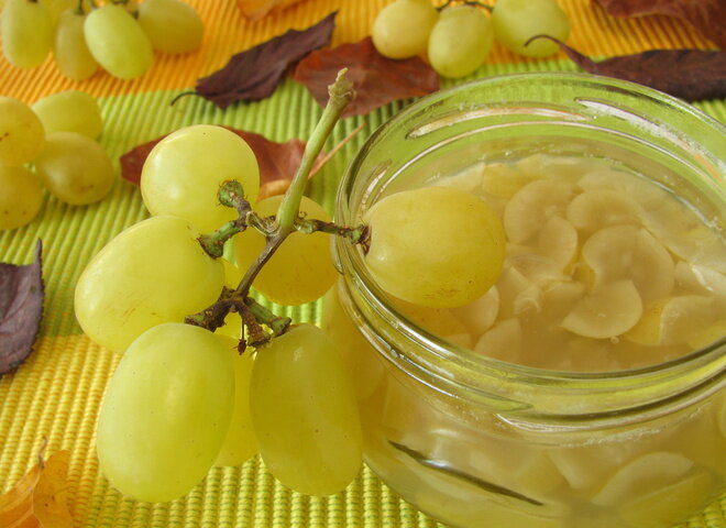 Несмотря на то, что виноград — вполне привычная для нас ягода, варенье из винограда не является таким популярным, как, например, малиновое или яблочное. А зря! 😉 Ингредиенты: 1 кг винограда, 1,2 кг сахара, 1 стакан воды. Приготовление: Подготовить виноград. Для варенья лучше выбирать крупные и средние ягоды. Перебрать и помыть виноград, удаляя подгнившие и поврежденные ягоды. Если варенье будет из винограда зеленых сортов, его желательно бланшировать 2 минуты до мягкого состояния в кипящей воде с 0,5 ч. ложки соли, а затем окунуть в холодную воду. Сорта синего и белого винограда в бланшировании не нуждаются. Сварить сахарный сироп. Поместить в него виноград, дать закипеть на большом огне, затем убавить огонь и варить 20 минут. Убрать варенье с огня и дать настояться 8-10 часов. Снова поставить вариться на 30-40 минут. Достать ягоды из сиропа, разложить в подготовленные стерилизованные банки. Сироп проварить еще 15 минут, залить им виноград и закатать. Перевернуть банки, укутать