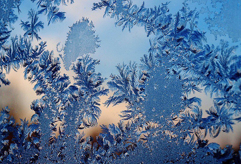 Морозные узоры на оконном стекле – удивительное и загадочное творение природы. Как будто под тончайшей кистью художника появляются на стекле сказочные леса и искрящиеся под солнцем пушистые от инея ветви. Скользя взглядом по изумительной картине, мы вновь и вновь задаемся вопросом, какое чудо создало на окнах эти зимние узоры. Причина появления ажурных белоснежных картин – осаждение водяных паров на холодном стекле с последующей кристаллизацией мельчайших капелек воды при отрицательных температурах. Главными условиями для создания ледяных кристаллов является высокая влажность воздуха и плавное охлаждение поверхности стекла. Среди всего многообразия ледяных узоров наиболее часто встречаются древовидные формы (дендриты) и узоры в виде волокнистых образований (трихиты). Образование той или иной разновидности зависит от окружающей среды: исходного состояния водяных паров и условий его охлаждения. При плавном охлаждении стекла от нуля до шести градусов мороза и незначительной концен