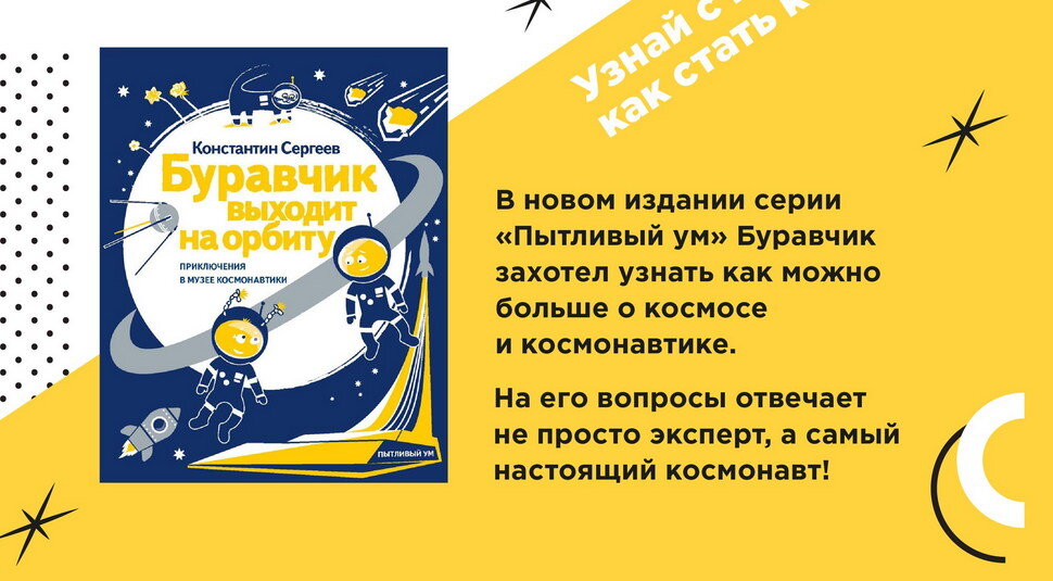 Подарок найден! На книжной полке магазина новый и долгожданный герой – Буравчик. Он всерьёз увлёкся космосом и пришёл за ответами в музей. Буравчик знакомится с настоящим космонавтом, большими космическими кораблями, ракетами и другими экспонатами, среди которых есть даже «космические пришельцы». А главное – сам принимает участие в исследовательской работе музея и узнаёт много нового из истории развития космонавтики: от первого искусственного спутника Земли – до первых орбитальных станций и современных исследований на борту Международной космической станции. Книгу можно приобрести в музейном магазине по адресу: Москва, метро «ВДНХ» Проспект Мира, 111. Присоединяйся: подпишись, у нас интересно!