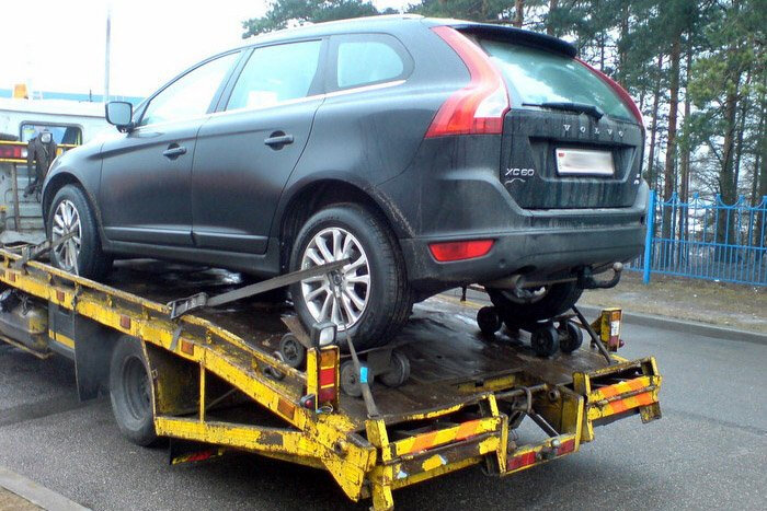 Автомобиль без "номеров", решетка вырвана, крылья "раскурочены" изнутри, что натолкнуло нашего героя на мысль, что это есть результат жесткой эвакуации автомобиля.