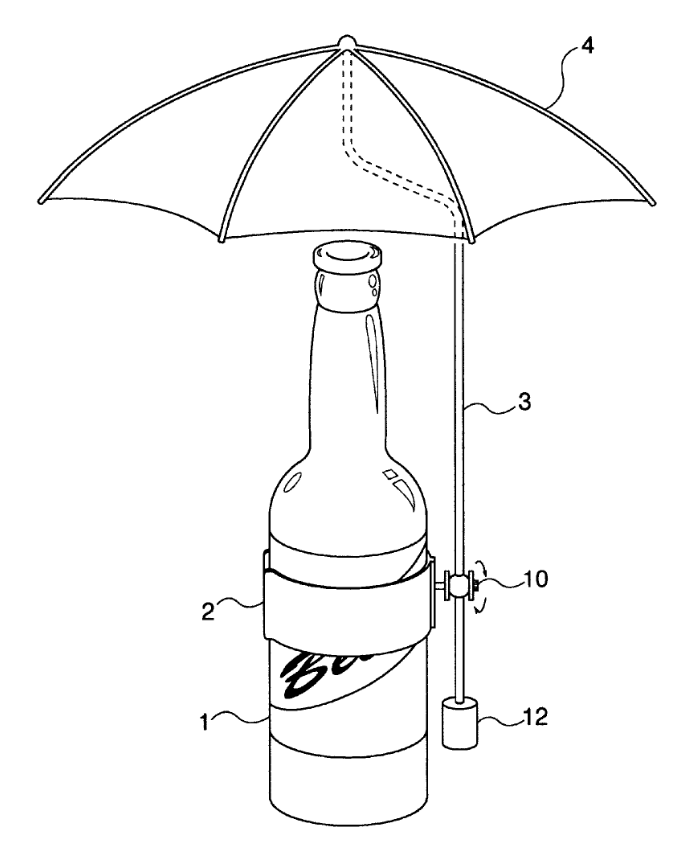 Запатентовать можно очень многое. Иногда чуть более нужное, а иногда - чуть менее. Но не нам судить! Встречаем патент на "пивозонт" - "Beerbrella" ( от англ. Beer + umbrella). Патент выдан в США под номером US 6637447. Сам патент US 6637447 B2 заявляет устройство, содержащее небольшой зонт диаметром приблизительно от 5 до 7 дюймов. Зонт может быть прикреплен к ёмкости для напитка любым из нескольких средств, включая зажим, ремень, может иметь "изолятор пены" и т.д. Устройство может быть снабжено стержнем, позволяющим зонтику находиться под подходящим углом для защиты от солнца или для эстетических целей. В одном варианте осуществления может быть предусмотрен шарнир и противовес, чтобы позволить зонтику поворачиваться в сторону, когда пользователь выпивает из контейнера. Какие мы видим изъяны в такой конструкции: