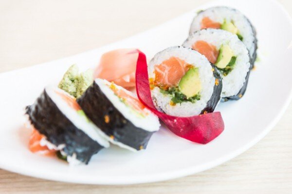 Рецепт домашних суши с креветками, авокадо и свежим огурцом. Креветки можно заменить слабосоленым филе лосося. Ингредиенты: рис для суши — 1 стакан, крупная соль — 1 ч.л., листы нори — 4-5 шт., сахар — щепотка, рисовый или яблочный уксус — 20 мл, креветки — 200 г, авокадо — 1/3 шт., небольшой свежий огурец — 1 шт., листья салата — маленький пучок, вода — 1 стакан. Приготовление: Отварить рис в 1 стакане воды. Добавить уксус, соль и сахар, перемешать и оставить на 20 минут. Креветки отварить и очистить. Авокадо и огурец почистить, нарезать тонкими полосками. Листья салата нарезать. На коврик для суши положить лист нори. Равномерно распределить сверху 1/4 или 1/5 часть вареного риса. На край положить часть начинки (креветки, авокадо, огурец и зелень). По желанию можно добавить немного икры летучей рыбы. С помощью коврика для суши свернуть лист нори с начинкой в ролл. Таким же образом приготовить роллы из оставшихся ингредиентов. Каждый рулет разрезать острым ножом на 6 частей. Подава