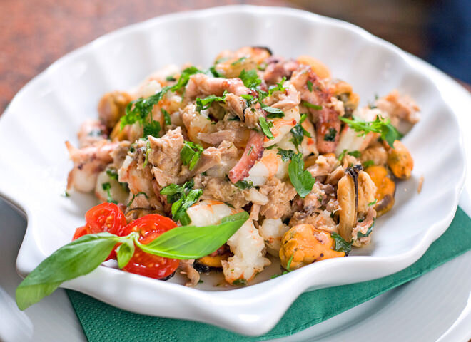 Салат из морепродуктов с тунцом под острым горчичным соусом порадует настоящим насыщенным вкусом мидий, креветок и рыбы. Такой салат из морепродуктов может послужить отличной закуской и дополнением к праздничному столу или же стать основным блюдом. Ингредиенты: 200 г мороженных креветок, 300 г маринованных мидий, 200 г консервированного тунца, 1 луковица, 2 помидора черри, зелень, 1 ч. ложка горчицы, 1 ст. ложка лимонного сока, 1 ст. оливкового масла, 2 ст. ложки белого вина, черный молотый перец по вкусу, соль по вкусу. Приготовление: Лук порезать тонкими четверть кольцами. Зелень измельчить. Помидоры порезать на половинки. Соединить горчицу, лимонный сок, оливковое масло, вино, посолить, поперчить и перемешать. В полученный маринад добавить лук и оставить на 10 минут, чтобы он настоялся. Креветки разморозить и опустить на 2-3 минуты в кипящую воду. Из мидий сцедить маринад. Тунца достать из масла, удалить косточки и размять вилкой. Смешать морепродукты, тунец и лук с маринадом.