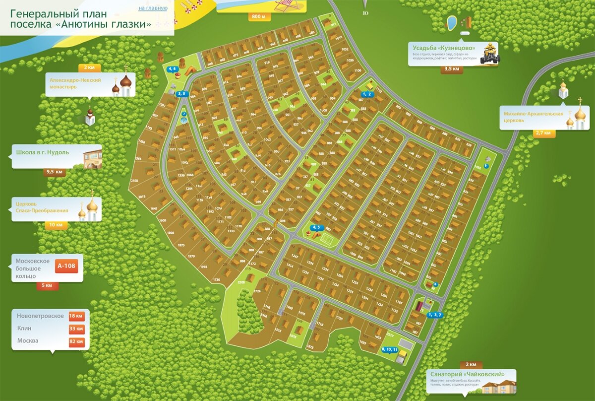 Поселок «Анютины глазки» как раз расположен на Новорижском шоссе, всего в 63 км от МКАД. Около часа езды на личном автомобиле по Новорижскому шоссе - и вы оказываетесь в чудесном, живописном месте поселке Анютины глазки. Он занимает площадь 16,7 га и состоит из 235 участков от 8 до 12 соток. Вы можете выбрать участок на свой вкус - на поляне с захватывающим панорамным видом или граничащий с лесом. Коттеджный поселок Анютины глазки имеет выход в лес, а также обустроенную пляжную зону на берегу реки Нудоль. Внутренняя инфраструктура поселка включает не только все коммуникации, подведенные к участкам, но и уличное освещение, ограждение поселка по фасаду, широкие улицы внутри поселка (главные улицы имеют ширину в пятнадцать метров, второстепенные в двенадцать и девять метров, дороги с твердым покрытием — 4,5 метра). Коттеджный поселок с коммуникациями Кроме привлекательной внутренней территории, у поселка масса других достоинств. Он расположен в красивом месте, на реке Нудоль. Вокруг по