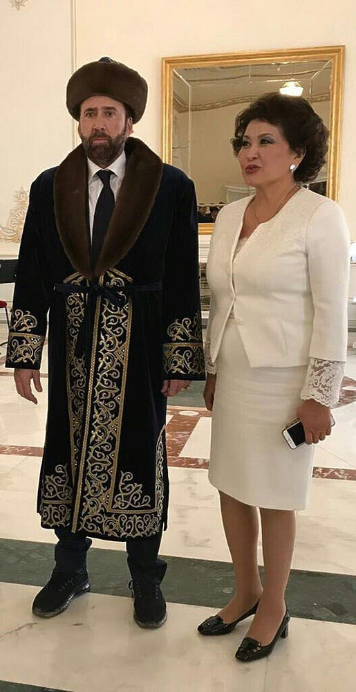 Фотография голливудского артиста Николаса Кейджа на казахском кинофестивале, на котором тот стоит с грустным видом в национальном уборе, чапане, около скрипачки Айман Мусаходжаевой, разошлось по сети. Юзеры тут же совершили множество коллажей, где Николас Кейдж в данном образе становится то победителем популярных плакатов, то картин.