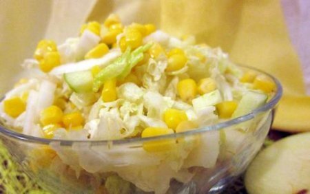 Ингредиенты Яблоко 1 шт. Кукуруза консервированная 100 гр. Пекинская капуста 0,5 качана Лимонный сок Соль Перец черный молотый Способ приготовления Шаг 1 У яблока удаляем сердцевину и мелко режем. Шаг 2 Капусту шинкуем. Шаг 3 Смешиваем в тарелке кукурузу, яблоко и капусту. Добавляем сок лимона, солим, перчим и перемешиваем.Приятного аппетита!