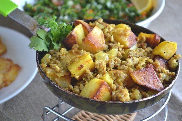 Ингредиенты: картофель - 1 кг фарш мясной - 500 г петрушка - 30 г масло растительное - 4 ст.л. паста томатная - 3 ст.л. чеснок - 4 зубчика перец черный молотый соль Приготовление: Разогреть в сковороде растительное масло, обжарить на нем мясной фарш. Соль и перец молотый – по вкусу, можно добавить любимые специи. Клубни картофеля очистить и нарезать кубиками, добавить в мясо, жарить все вместе в течение пяти-семи минут, до образования золотистой корочки. В стакане теплой воды развести томатную пасту, добавить очищенный и натертый чеснок, соль. Массу перелить к картофелю, тушить под крышкой в течение 25–30 минут на тихом огне. При готовности жареный картофель с фаршем посыпать рубленой зеленью, украсить помидорами черри.