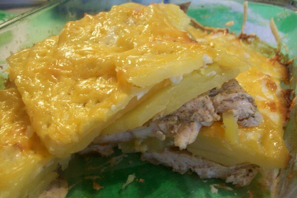 Куриное филе нарезать на плоские куски, отбить молоточком на кухонной доске. Поперчить по вкусу и обмазать с двух сторон майонезом. Сложить отбивные друг на друга. Майонез можно заменить на готовую столовую горчицу. Нарезать крупную луковицу полукольцами. Очистить и нарезать пластинками клубни картофеля.