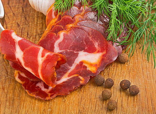 Вяление, помимо копчения и консервации – это один из эффективных и вкусных способов длительного хранения продуктов. При помощи вяления можно заготовить мясные или рыбные продукты впрок, а также создать поистине великолепный деликатес — вяленое мясо. Вяленое мясо потребует довольно много сил и времени, а главное — выдержки. Ведь это необыкновенно ароматное и вкусное лакомство, поэтому будет сложно удержаться и не съесть его до конца производственного процесса. Приготовленное собственноручно вяленое мясо позволяет не сомневаться в его качестве и составе, ведь оно не содержит консервантов и вредных для организма наполнителей — все только натуральное. Поэтому такое мяско может не только хорошо вписаться в нарезку на праздничный стол, но и употребляться по будням вместо покупной копченой колбасы. Ингредиенты: 1 кг свинины, 1 л воды, 5 ст. ложек соли, 1 ст. ложка сахара. специи для рассола: 2 шт. лавровых листа, 5 горошинок душистого перца, 1 шт. гвоздики. специи для натирания мяса: к