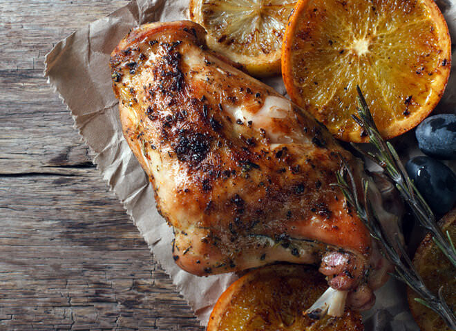 Ваши гости обязательно останутся довольны необычным сочетанием кролика, оливок, апельсинов и душистого розмарина. Ингредиенты: 1,5 кг мяса кролика, 50 г соленого свиного сала, 2 луковицы, 2 зубка чеснока, 2 апельсина, 100 г консервированных оливок, 200 мл белого сухого вина, 3 ст. ложки оливкового масла, 2 веточки розмарина, корица молотая по вкусу, перец красный молотый по вкусу, перец черный молотый по вкусу, соль по вкусу. Приготовление: Кролика вымыть, обсушить салфеткой, удалить пленки и остатки жира. Тушку кролика порезать на крупные куски. Смешать мясо кролика с кусочками сала, посолить, поперчить и перемешать. Мелко порезать лук. Измельчить чеснок. Снять с апельсина цедру − достаточно 0,5 ч. ложки. Пол-апельсина порезать на дольки. Из оставшихся апельсинов выжать сок. Обжарить кролика в сотейнике в разогретом оливковом масле на среднем огне, переворачивая, до золотистого цвета в течение 4-5 минут. Уменьшить огонь, добавить оливковое масло, лук, чеснок и обжаривать мясо, пер