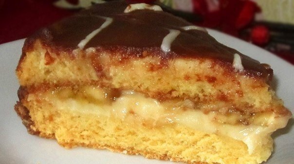 Ингредиенты: 4 яйца 1 ст. сахара 1 ст. муки 1 ч. л. разрыхлителя (или не полная ч.л. гашеной соды) Крем: 1 яйцо 0,5 ст. сахара 2,5 ст. л . муки 1 ст. молока 50 г. масла ваниль Глазурь: 50 гр. сливочного масла 1,5 ст.ложки сметаны 0,5 стакана сахара 2 ст. ложки какао Для пропитки коржей: молоко сахар ваниль Банан для прослойки Приготовление: 1.Сначала, конечно, готовим тесто для коржей. Яйца взбиваем с сахаром, так, чтобы сахар максимально растворился и масса увеличилась в объеме почти в 2 раза. 2.Муку просеять, смешать с разрыхлителем и добавляя небольшими порциями замешиваем тесто. 3.Мруку для выпечки ( у меня 22см в диаметре) смазываем маслом и выливаем в нее тесто для торта. 4.Выпекаем корж в разогретой до 180*С духовке около 30 - 40 минут. Когда он хорошо пропечется (он и поднимается хорошо), выключите духовку и не вынимайте корж из духовки пока духовка не остынет, затем достаньте корж и разрежьте его на 2 части, если высота позволяет можно и на 3 ч