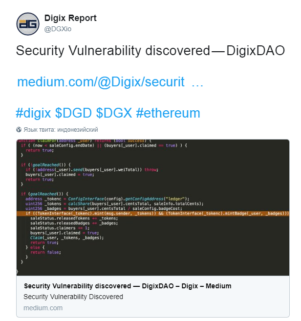 Неизвестные хакеры взломали 35 адресов владельцев Digix и украли 4162,2647 токенов DGD на общую сумму 260000$. Об этом инциденте сообщили в официальном твиттер аккаунте проекта. Команда проекта Digix заявила о полной готовности к возмещению украденных средств.