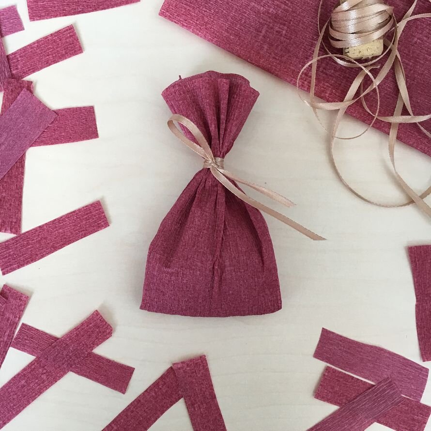 Подарки гостям — это своего рода благодарность за визит на свадьбу. Подарить можно что угодно — от овсяного печенья с шоколадом до миниатюрной книжечки. Главное, упаковать симпатично и с душой. Предлагаем вам мастер-класс именно такого вида бонбоньерки-мешочка своими руками. Для создания бонбоньерки-мешочка вам понадобятся: - гофрированная или другая мягкая бумага