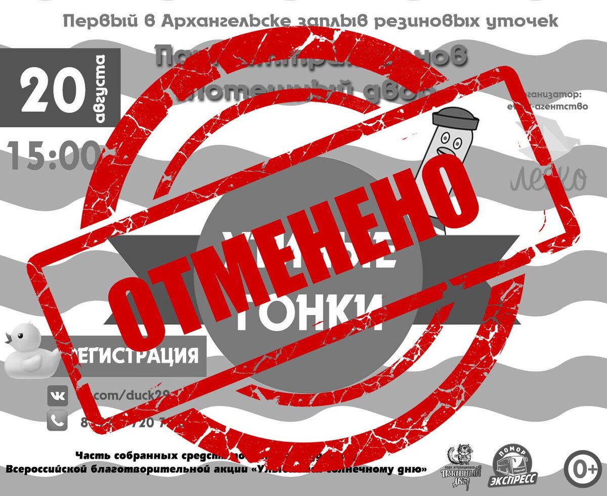 20 августа сего года, в Детском парке Архангельска должны были пройти гонки уточек. Интересная затея: пронумерованных уточек должны были пустить покорять аттракцион «Индейская река». Кто не знает: по сути — желоб по которому вода идет под напором и каноэ с детьми. Событие благотворительное: средства собираются в поддержку Всероссийской благотворительной акции «Улыбнемся каждому дню». Такие заплывы ежегодно проходят во многих городах России: Москва, Санкт-Петербург, Саратов, Красноярск, Ульяновск и т.д. Группа мероприятия: https://vk.com/duck29 Но «кина не будет». Угадайте почему? Власти города/области (?) боятся уточки, ведь она была символом недавних протестов! В группе акции написано, что мероприятие отменено по независящим от организаторов причинам. На личной странице одного из оргов (как я понимаю) это прокоментировано куда конкретнее. (скриншоты на всякий случай: сообщение в группе, пост организатора) Вы думаете совпадение? Не верите, что из-за этого? Тогда вот вам ещё история. Б
