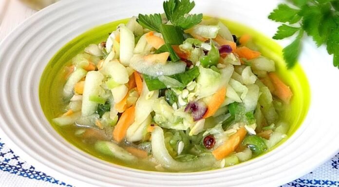 - Выложить салат по плечики в банки, залить получившимся соком до верха. Прикрыть банки крышками или не полностью закрутить и стерилизовать 1 л банки – 40 мин.