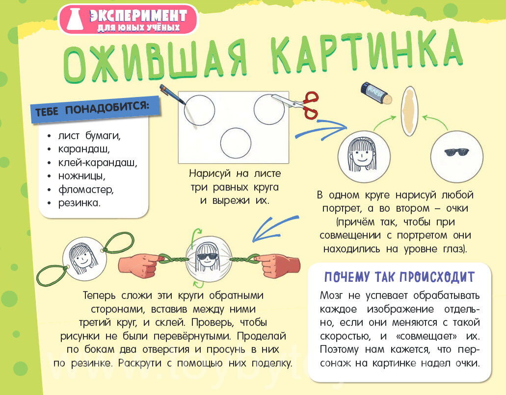 ЭКСПЕРИМЕНТ ДЛЯ ЮНЫХ УЧЁНЫХ: Ожившая картинка Нарисуй на листе три равных круга и вырежи их. В одном круге нарисуй любой портрет, а во втором – очки (причём так, чтобы при совмещении с портретом они находились на уровне глаз). Теперь сложи эти круги обратными сторонами, вставив между ними третий круг, и склей. Проверь, чтобы рисунки не были перевёрнутыми. Проделай по бокам два отверстия и просунь в них по резинке. Раскрути с помощью них поделку. Понадобятся: