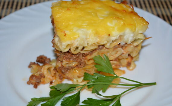 5. Заливаем запеканку приготовленным соусом "Бешамель". Посыпаем тертым сыром. Отправляем блюдо в духовку на 25 минут. Температура приготовления — 180 ºC.
