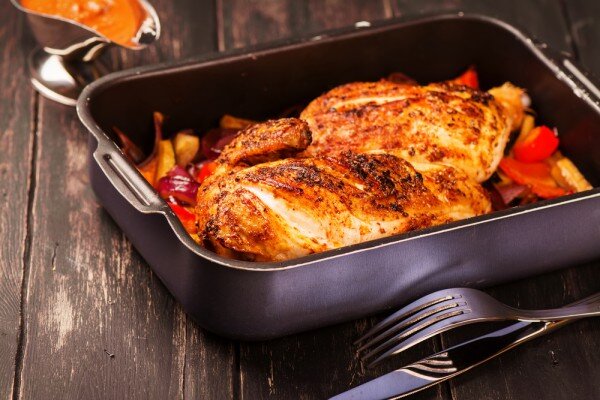 Ингредиенты: белое сухое вино — 200 мл тушка курицы — 1.2 кг болгарский перец разных цветов — 3 шт. лимон — 2 шт. маленький пучок петрушки чеснок — 5-6 долек оливковое масло молотый острый красный перец — 1 ч.л. молотый черный перец — 1/3 ч.л. соль Приготовление: Разогреть духовку до 225 градусов. Болгарский перец помыть и запекать в духовке в течение 40 минут. Готовые перцы должны быть очень мягкими. Остудить перцы, удалить с них кожицу, очистить от семян и сложить в миску. Петрушку и очищенный чеснок мелко порубить. Курицу помыть, разделать на порционные куски и положить в миску. Полить курицу свежевыжатым лимонным соком, добавить петрушку с чесноком, черный и острый красный перец. Перемешать и поставить в холодильник мариноваться на 2 часа. Полить курицу оливковым маслом, посолить и еще раз перемешать. Разогреть духовку до 180 градусов. Выложить куски курицы кожей вверх на противень и запекать в духовке 1,5 часа. Периодически нужно доставать из духовки противень с курицей и поли