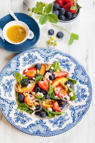 Ингредиенты: для салата: беби-шпинат — 1 пучок красный лук — 1/2 шт. небольшие персики — 2 шт. клубника — 150 г голубика — большая горсть грецкие орехи — горсть козий сыр — 100 г для заправки: оливковое масло — 2-3 ст.л. лимонный сок — 1 ст.л. жидкий мед — 1 ст.л. соль молотый перец Приготовление: Листья молодого шпината помыть и обсушить. Лук почистить и нарезать тонкими полукольцами. Помыть персики, клубнику и голубику. Персики нарезать дольками, удалив косточку. Клубнику нарезать тонкими пластинками. Застелить тарелку салатными листьями. Сверху выложить лук, голубику, персики и клубнику. Посыпать поджаренными грецкими орехами и раскрошенным сыром. Для заправки смешать оливковое масло, соль, перец, лимонный сок и мед. Полить салат. Приятного аппетита! 😉 Понравился рецепт? Поставьте лайк 💙 😉 Наш сайт - https://recase.org 😉 Мы вконтакте - https://vk.com/recase_org
