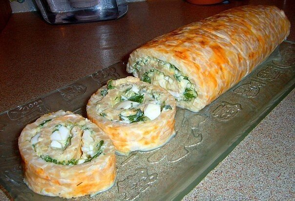 🔸на 100 грамм - 117.16 ккал🔸Б/Ж/У - 117.16/5.43/1.61🔸 Ингредиенты: Кальмары (вареные) – 600 гр Тертый сыр – 150 гр Сырое куриное яйцо – 2 шт Вареное куриное яйцо – 3 шт Творог- 100 гр Огурец свежий – 1 шт Огурец маринованный – 1 шт Зелень любая – 1 пучок; Специи - по вкусу. Приготовление: 1. Кальмары измельчила, смешала с тертым сыром, посолила, поперчила. 2. Смешала их с тертым сыром и 2 взбитыми яйцами. 3. Полученную массу распределила на противне на бумаге для выпечки и запекла минут 10 при 200 градусах в разогретой духовке. 4. Пока кальмары запекались, порезала огурцы и зелень. 5. Также измельчила вареные яйца. 6. Запеченный пласт слегка остудила , а потом густо промазала творогом. 7. Распределила на нем огурцы и зелень. Сверху еще промазала творог и выложила порезанные яйца. 8. Свернула пласт в рулет, запаковала в фольгу и подержала в ней до остывания где-то час. Приятного аппетита!
