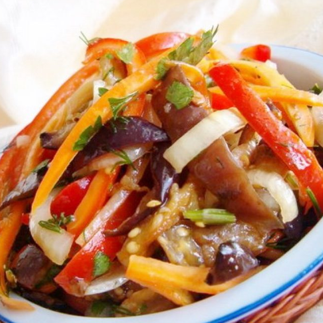 Для любителей острых закусок, предлагаем попробовать наш рецепт, научили нас ему корейцы. Секрет этой закуски заключается в выдержке: чем дольше она настаивается, тем вкуснее становится. Ингредиенты 1 кг баклажанов По щепотке зерен черного перца и кориандра 1 чайная ложка семян кунжута 2 средние луковицы 1 чайная ложка красного острого перца 20 мл 9% уксуса 1 столовая ложка соли 1 красный мясистый болгарский перца 1 пучок кинзы 3-4 зубчика чеснока 30 мл соевого соуса 1-2 чайные ложки сахара 100 мл растительного масла Соль и перец по вкусу Приготовление Баклажаны помоем и пропарим в пароварке, 8-10 минут, не больше. Не перевариваем! Они должны быть слегка плотные. Оставим остывать, а после нарежем брусочками 1*3 см. На раскаленную сковороду, бросаем черный перца, кориандр и кунжут, и пару минут прожариваем. Как только кунжут начал менять цвет, убираем с огня, и перемалываем всю смесь в кофемолке. Нагреваем сковороду, наливаем растительное масло, и обжарим одну луковицу, порезанную по