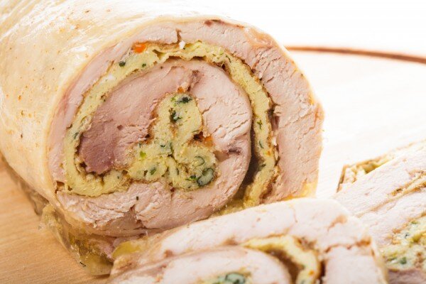 Фаршированный куриный рулет – это универсальная холодная закуска. Из него можно сделать бутерброды или просто подать с любым гарниром на свой вкус. Ингредиенты: тушка курицы — 1 шт. яйца — 4 шт. молоко — 60 мл ветчина — 200 г лук- 1 шт. сливочное масло — 10 г петрушка укроп корень петрушки соль, молотый перец Приготовление: Подготовить тушку курицы. Сделать надрез вдоль хребта, снять кожицу, отрезать крылья и ножки. Оставшуюся мякоть нарезать тонкими пластинами. Из костей сварить бульон. Яйца взбить с молоком и солью, пожарить как омлет. Куриную кожу разложить на кухонной доске, сверху выложить мякоть птицы, посыпанную специями и солью, тонко нарезанную ветчину, омлет и мелко нарубленную зелень. Свернуть кожу в виде рулета, перевязать кулинарной нитью. Залить процеженным бульоном и довести до кипения. Добавить лук, корень петрушки и варить в течение часа. Слить бульон, убрать нитки и положить рулет под пресс в холодильник на 2-3 часа. Приятного аппетита! 😉 Понравился рецепт? Пост