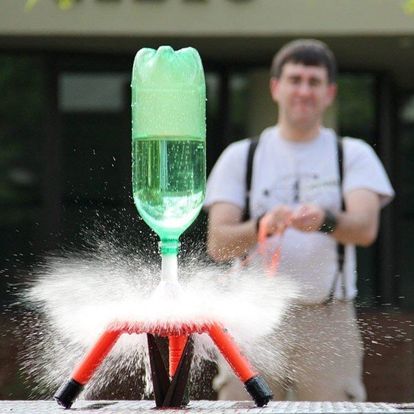 Принцип действия водяной ракеты предельно прост. Нужна пластиковая бутылка, на треть наполненная водой, велосипедный или автомобильный насос, ниппель и стартовая площадка (пусковая установка), на которой ракета фиксируется. Насос нагнетает воздух — бутылка высоко и далеко летит, разбрызгивая воду вокруг. Всё «топливо» выдавливается в первые мгновения после старта, а дальше ракета летит по баллистической траектории (поэтому центр тяжести выносят максимально вперёд). Но вот технические вариации изготовления этой конструкции могут быть самыми разными. Некоторые любители создают настоящие шедевры. 1. Выбираем бутылку Ракета не должна быть слишком длинной или слишком короткой, иначе полёт выйдет кривой или вообще не состоится. Оптимальное соотношение диаметр/длина 1 к 7. Объём в 1,5 литра вполне подойдёт для первых экспериментов. 2. Подбираем пробку Вам понадобится пробка-клапан от лимонада или любого другого напитка. Это будет сопло ракеты. Важно, чтобы клапан был новый, не изношенный,