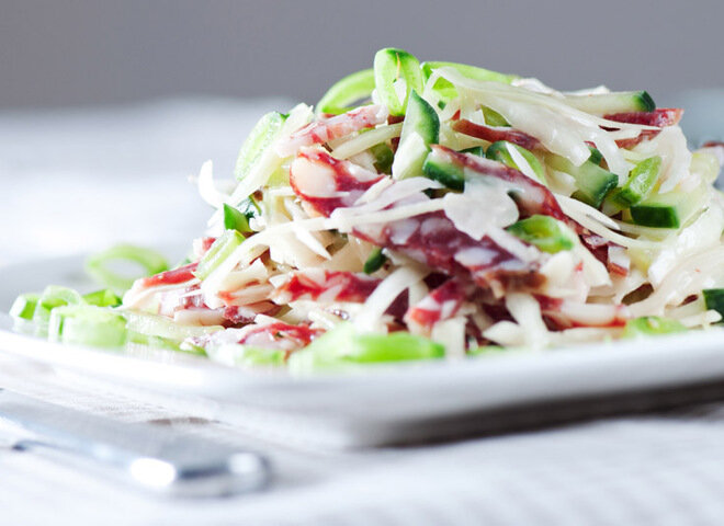 Салат из капусты с колбасой и сухариками